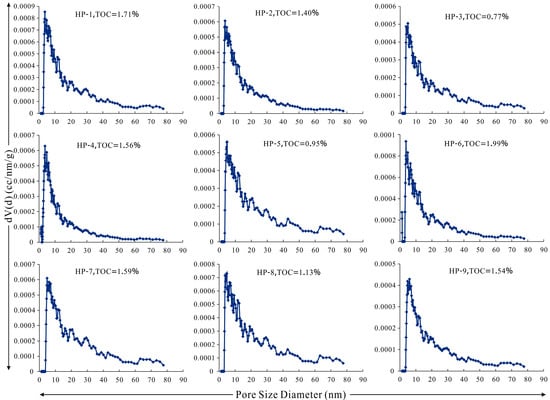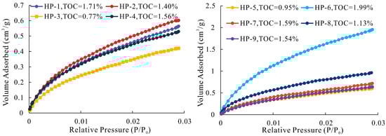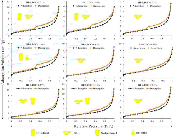 The adsorption and desorption data of the samples are shown in Figure 2, and the overall shape of the curves is an inverse “S” shape, which is most similar to type IV in the IUPAC isotherm classification standard [48], indicating that mesopores (2–50 nm) are relatively common in the sample. The adsorption processes of shale samples are composed of three phases. The first phase (0 < P/P0 ≤ 0.45) is a low-pressure phase, where the sorption capacity of the samples gradually increases, and the line is gently convex. In this stage, monomolecular adsorption is the main type of adsorption, and the inflection point of the isothermal adsorption line is the transition point from monomolecular adsorption to multimolecular adsorption. The second phase (0.45 < P/P0 ≤ 0.9) shows that the sorption isotherm increases rapidly with increasing relative pressure, and a hysteresis loop appears. In this stage, multimolecular layer adsorption occurs in the pores. The third phase (0.9 < P/P0 < 1.0) reveals that the relative pressure continues to increase as the adsorption capacity of the sample increases sharply. When the relative pressure is close to 1.0, there is no adsorption saturation phenomenon, mainly because of the capillary condensation of nitrogen (Figure 3).