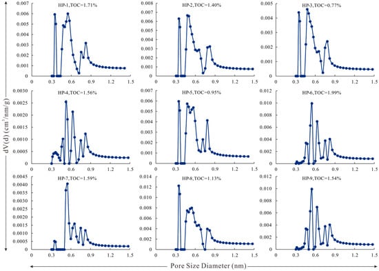 The CO2 adsorption curves of the samples are similar to the Class I isotherms of the adsorption isotherms proposed by the IUPAC [48]. Within the low-pressure section (P/P0 < 0.01), the adsorption amount is small, but the adsorption amount increases sharply. This indicates that there are a certain number of micropores in the shale (Figure 5). As shown in Figure 5, the adsorption capacity increases significantly with increasing TOC content, which indicates that the TOC content is a key factor affecting micropore development in shale [22,23,24]. The SSA, PV, and PSD of the samples were calculated via the DFT model (Table 2). The values of micropores ranged from 0.001 to 0.003 cm3/g, with a mean of 0.002 cm3/g. The SSA varied from 1.749 to 9.871 m2/g, with a mean of 5.147 m2/g. The average pore diameter changed from 0.349 to 0.822 nm, with a mean of 0.511 nm. Figure 6 shows the multipeak PSD of the samples, with peaks ranging from 0.33 to 0.40 nm, 0.50 to 0.70 nm, and 0.70 to 0.90 nm. The corresponding peak values are 0.34 nm, 0.54 nm, and 0.83 nm, respectively. The PVs of micropores are mainly 0.30~0.90 nm in diameter.
