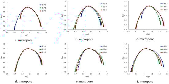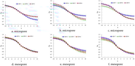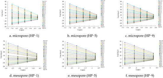 Figure 7 shows the fitting curve of and for order q with integers within [−10, 10]. and show an obvious linear relationship for both low-pressure CO2 adsorption and low-temperature N2 adsorption, implying that the PSD of the samples has multifractal features [44]. When q is greater than 0, a positive relationship between and occurs; when q is less than 0, is negative with . The PSDs of micropores and mesopores are relatively concentrated, with most pores corresponding to small pores.