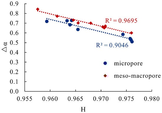 Relationship between Hurst (H) and the multifractal spectrum width (Δα) of micropores and meso–macro pores in the Daanzhai Member shale in the Ziliujing Formation.