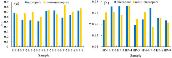 Liu et al. [35] studied the geological significance of the Hurst index and reported that the value of H is strongly correlated with porosity. In addition, the Hurst index can also be applied to characterize the connectivity of pore networks, and the connectivity performance affects the seepage characteristics of a sample. A smaller Hurst value represents poorer connectivity. Figure 10 shows the relationship between the pore connectivity (H) and the degree of heterogeneity (Δα). For micropores and mesopores, the degree of heterogeneity decreases gradually with increasing connectivity, indicating that the porosity has a good degree of heterogeneity, and the degree of heterogeneity in the micropores is lower than that in the mesopores. The Hurst values of the micropores vary from 0.959 to 0.976, and those of the mesopores change from 0.958 to 0.976 (Table 3 and Table 4). The heterogeneity of the mesopores is greater than that of the micropores (Figure 11a). The H value of the micropores is greater than that of the mesopores, indicating that the pore connectivity of the micropores is better than that of the mesopores (Figure 11b). The results show that the medium- and large-scale pores in the shale in the study area have strong heterogeneity, but their pore connectivity is lower than that of the small-scale pores. This conclusion differs from the research results of Wang et al. [29] and Liu et al. [35]. Wang et al. [29] reported that the shale in the marine Longmaxi Formation shale has medium- and small-scale pores with strong heterogeneity and well-connected large-scale pores. Liu et al. [35] reported that the pore connectivity of Bakken shale micropores is stronger than that of medium pores and that the heterogeneity in micropores is weaker than that in medium pores. This difference is due mainly to the large difference in the maturity and TOC content between marine shale and continental shale, which further affects the development of pores [24,29].
