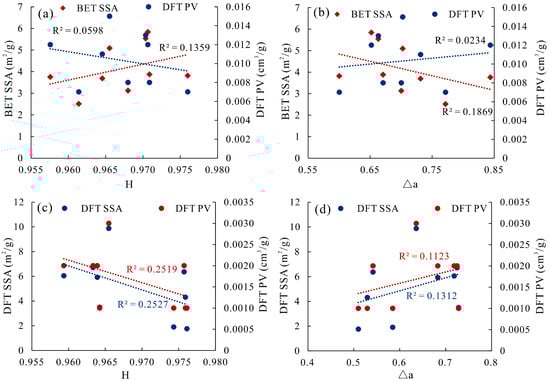 Relationships between the shale pore structure parameters and the multifractal spectral width Δα and Hurst index of the Daanzhai Member. (a,b) BET SSA and DFT PV for medium to large holes, and (c,d) BET SSA and DFT PV for micropores.