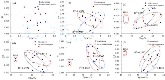 Relationships between the TOC content, mineral composition, multifractal spectral width Δα, and Hurst index of the Daanzhai Member shale (a). no correlation between TOC and H either micropore or meso–macropore; (b). negative relationship between Δα of meso–macropore and TOC, positive correlation between Δα of micropore and TOC; (c). positive correlation between H and clay regardless of micropore and mesopore–macropore; (d). negative correlation between Δα and clay regardless of micropore and mesopore–macropore; (e). negative relationship between H and quartz either micropore or meso–macropore; (f). positive correlation between Δα and quartz regardless of micropore and meso–macropore.