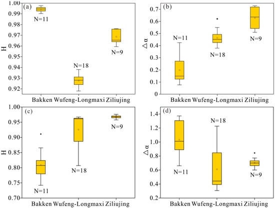 Figure 14 shows the results of the multifractal parameters calculated via gas adsorption tests for different shales. The Δα values of the marine Bakken Formation shale vary from 0.093 to 0.424, with a mean of 0.198, and the H values range from 0.990 to 0.998, with a mean of 0.994. The micropore Δα values of the Wufeng–Longmaxi Formation shale vary from 0.379 to 0.621, with a mean of 0.464, and the H values range from 0.918 to 0.938, with a mean of 0.928. The micropore Δα values of the Daanzhai Member shale of the Ziliujing Formation vary from 0.529 to 0.728, with a mean of 0.628, and the H values range from 0.959 to 0.976, with a mean of 0.969 (Figure 14a,b). These findings indicate that the small-scale pore heterogeneity in lacustrine shales is greater than that in marine shales, but the pore connectivity in lacustrine shales is poorer than that in marine shales. The H value of the Bakken Formation shale varies from 0.742 to 0.911, with a mean of 0.809, and △α changes from 0.661 to 1.373, with a mean of 1.033 (Figure 14c,d). The H values of the Wufeng–Longmaxi Formation shale range from 0.807 to 0.967, with an average of 0.926, and the △α values range from 0.344 to 1.227, with an average of 0.611. The H values of the continental shales in the Ziliujing Formation vary from 0.958 to 0.976, with an average of 0.967, and the △α values range from 0.600 to 0.844, with an average of 0.704. Consequently, the connectivity of the large-scale pores in lacustrine shales is greater than that in marine shales, but the heterogeneity of the pores is less than that in marine shales. Therefore, compared with those of marine shales, the pores of the continental Daanzhai Member shale are more uniform, which may be related to the mineral composition, TOC content, burial history, bedding, and rock facies [23]. From the perspective of thermal maturity, the H values of the micropores decrease with increasing maturity, and the H values of the mesopores increase, indicating that the degree of pore connectivity increases with increasing thermal maturity; the Δα values of micropores first increase and then decrease with increasing thermal maturity, and the Δα values of mesopores decrease, indicating that the heterogeneity of pores decreases.