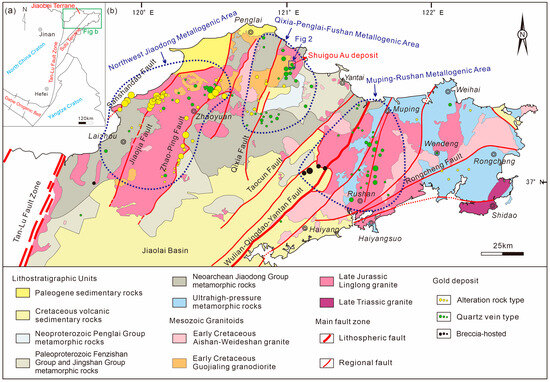 (a) Tectonic location of the Jiaodong Peninsula; (b) Simplified geological map of the Jiaodong Peninsula, showing the distribution of major tectonic units, Mesozoic igneous rocks, faults, and Au deposits (modified from [7]). The division of the Northwest Jiaodong, Qixia-Penglai-Fushan, and Mouping-Rushan Metallogenic Areas is based on [2].