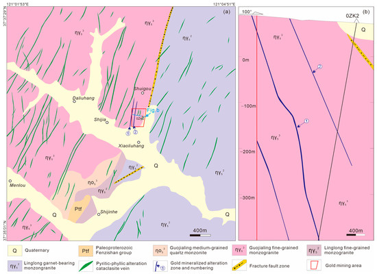 The Shuigou gold deposit is a quartz vein-type gold deposit with a reserve exceeding 5 tons of gold. It is situated in Daliuhang, to the northeast of Penglai City (Figure 1b and Figure 2a). The gold deposit district is characterized by well-developed fault structures that trend NNE–NE, including the Shuigou fault, F1 fault, and F2 fault. The primary igneous rocks in the area are the Linglong monzogranite and the Guojialing monzogranite (Figure 2a), which are found on both sides of the Shuigou fault. Additionally, late Yanshanian diorite porphyrite and porphyry, which intersect the gold-bearing quartz veins, are also present.
