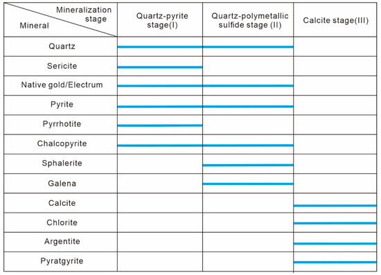 The primary ore minerals found in the Shuigou gold deposit are native gold, electrum, and pyrite, along with minor amounts of pyrrhotite, sphalerite, galena, and chalcopyrite. The gangue minerals primarily consist of quartz, feldspar, sericite, chlorite, and calcite. The main ore textures observed include crushed, euhedral, subhedral-anhedral, replacement-dissolution, inclusion, filling, and colloform textures. Mineralization occurs in three distinct stages: the quartz-pyrite stage (I), the quartz-polymetallic sulfide stage (II), and the calcite stage (III). Gold is mainly precipitated in stages I and II (Figure 3 and Figure 4).