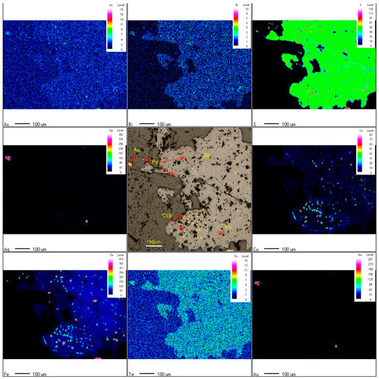 In contrast, EPMA spot analyses indicate that Py1 and Py2 (n = 14) contain arsenic levels ranging from 0 to 0.417 wt%, Pyr1 (n = 5) shows values between 0.011 and 0.070 wt% As Sp2 (n = 5) demonstrates arsenic content from 0 to 0.034 wt% As (see Supplementary Table S1). These findings suggest that arsenic primarily occurs in pyrite as an isomorphic substitution. Moreover, EPMA mapping of pyrite indicates that As is unevenly distributed within the mineral (Figure 5.). The distribution of Bi and Te aligns closely with that of gold. EPMA mapping reveals that the Bi and Te content increase in areas where native gold and electrum are present (see Figure 5 and Figure 6). The composition of Bi and Te in the gold minerals ranges from 0.249 to 0.628 wt% Bi and from 0 to 0.115 wt% for Te. EPMA analyses indicate that the pyrite, pyrrhotite, and sphalerite from different stages of mineralization contain minimal amounts of Bi and Te (refer to Supplementary Table S1). These findings suggest that Bi and Te may exist as nanoparticles either on the surface or within the fissure of the gold minerals [46].