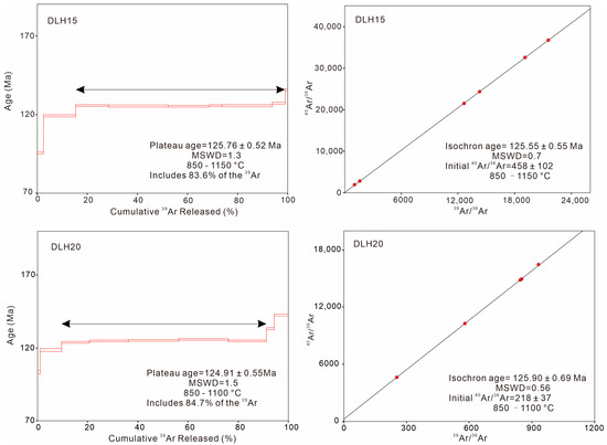 The two muscovite samples yield well-defined 40Ar/39Ar plateau ages. Sample 13DLH15 has a plateau age of 125.76 ± 0.52 Ma, based on 83.6% of the released 39Ar, while sample 14DLH20 yields a plateau age of 126.8 ± 0.59 Ma based on 84.7% of the released 39Ar. Additionally, the isochron ages for the two samples are 125.55 ± 0.55 Ma and 125.90 ± 0.69 Ma, respectively. These isochron ages are consistent with the plateau ages within the margin of error (Figure 8 and Table 2).