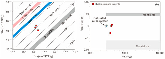 Fluid inclusions trapped in pyrite can preserve their noble gas compositions, such as helium (He) and argon (Ar), for up to a hundred million years. This makes them increasingly valuable for tracing ore-forming fluids [48,49,50]. There are three major reservoirs of helium on Earth: (1) the mantle, which has a 3He/4He ratio of 6–9 Ra; (2) the continental crust, with a 3He/4He ratio of 0.01–0.05 Ra; and (3) the atmosphere, where the 3He/4He ratio is 1 Ra.