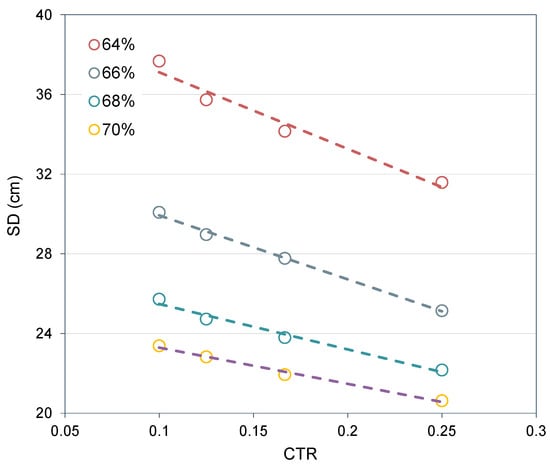 The SC plays a critical role in determining the fluidity of fresh STCPB. As shown in Table 3, increasing the SC from 64% to 70% leads to a consistent decrease in the SD across all CTRs (Figure 3). This behavior is attributed to the reduction in free water content at higher SC levels, which lowers fluidity by limiting the movement of particles [,]. To more effectively investigate how the SD of STCPB samples changes with varying SC, the CTR was held constant. Linear, exponential, and logarithmic fittings were applied to the SD data, and the corresponding correlation coefficients are summarized in Table 3. It is apparent that all fitted correlation coefficients are relatively high, with all exceeding 0.9. The correlation coefficient for the logarithmic fit is the highest, reaching 0.995. Thus, the relationship between the SC and SD of STCPB is best described by a logarithmic equation. The corresponding expression is as follows: