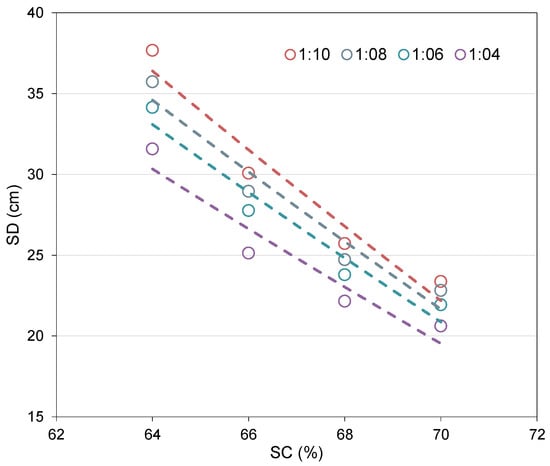 The SC was held constant while the CTR was varied to investigate the fluidity of fresh STCPB. The changes in fluidity were quantified by fitting the data using linear, exponential, and logarithmic models, and the corresponding correlation coefficients (R2) were calculated. The results are presented in Table 2. The SD scatter plots and linear fitting of STCPB with varying SC and CTRs are shown in Figure 2.