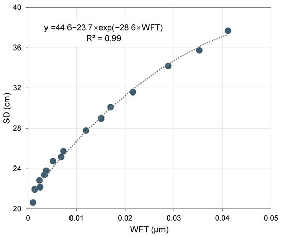 To further investigate the mechanism underlying the fluidity of STCPB, WFT was introduced. Previous studies [,,] have established that WFT is a critical factor influencing the fluidity of CPB. However, these studies primarily focus on conventional CPB, highlighting the need to explore the quantitative relationship between WFT and the SD of STCPB. The results are presented in Figure 4, which clearly illustrates a positive and significant correlation between WFT and the SD of STCPB. Specifically, as the WFT increases from 0.001 to 0.041 µm, the SD increases from 20.63 to 37.68 cm. Regression analysis reveals a strong exponential relationship between the WFT and SD, with a correlation coefficient of 0.99. This indicates that an increase in WFT leads to a corresponding increase in the SD of STCPB, suggesting an enhancement in the fluidity of the material. This behavior can be attributed to the mechanism whereby a thicker water film layer reduces inter-particle friction, allowing particles to move more freely, thereby improving fluidity []. A similar relationship between the SD and WFT was observed by Qiu et al. [] when studying traditional CPB. Thus, for STCPB, as with conventional CPB, WFT is also a key factor influencing fluidity.