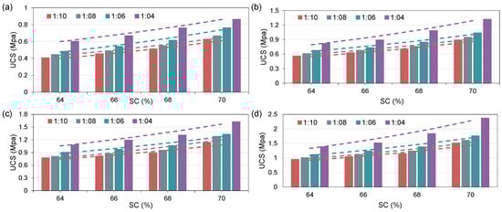 Table 4 presents the UCS values of STCPB at various proportions. The CTR and SC are considered the two primary factors influencing the UCS of backfill materials. To investigate the quantitative relationships between the UCS of STCPB and these two factors, a systematic approach was employed in which one factor was varied while the other was held constant. This method was adopted to eliminate the potential effects of factor interactions and isolate the influence of each individual factor on UCS.