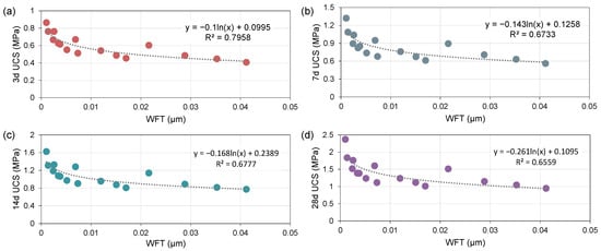 Relationship between WFT and UCS of STCPB at different curing times: (a) 3 days; (b) 7 days; (c) 14 days; (d) 28 days.
