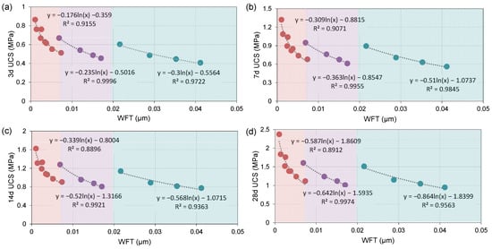 Figure 7 shows the relationship between WFT and the UCS of STCPB. It is evident that regardless of curing time, the UCS data points exhibit considerable scatter, and the fitting results based on the logarithmic function yield a low correlation coefficient. This suggests that using WFT as a sole variable is insufficient to fully capture the variation in the UCS of STCPB. The influence of WFT on UCS is complex, involving interactions among multiple factors. Differences in particle morphology, surface characteristics, and hydration processes between superfine cement and superfine tailings cause the impact of WFT on UCS to vary under different conditions. Due to its larger specific surface area, superfine cement interacts more extensively with water, leading to a faster and more complete hydration reaction []. In contrast, superfine tailings alter the interaction between cement and tailings particles. In particular, within different WFT ranges, the influence of the water film on cement hydration and particle interactions differs, making it difficult for a single fitting method to fully capture the complex relationship between WFT and UCS.