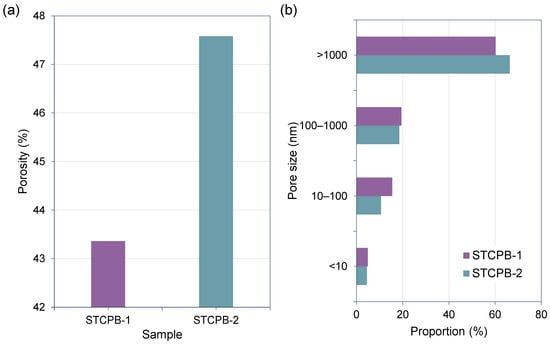 Pore structure characteristics of STCPB-1 and STCPB-2: (a) porosity; (b) pore size distribution.