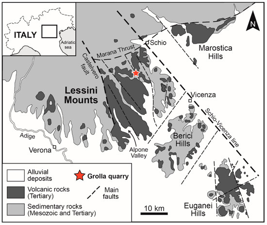 Simplified geological map of the Veneto Volcanic Province highlighting the Lessini Mountains and the location of the Grolla quarry.