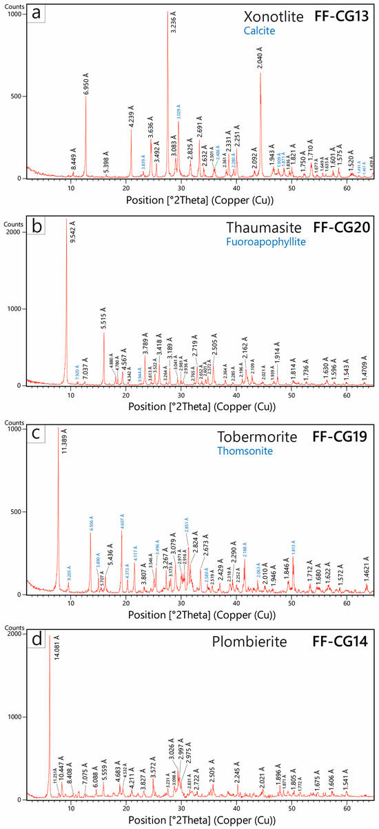XRD patterns of the natural C-S-H minerals from the Grolla quarry, with the indication of D-spacing. (a) Xonotlite with minor calcite (FF-CF13); (b) thaumasite with minor fluoroapophyllite (FF-CG20); (c) Tobermorite with subordinate thomsonite from (FF-CG19); (d) plombierite (FF-CG14). The d-spacing values of minor minerals are in blue.