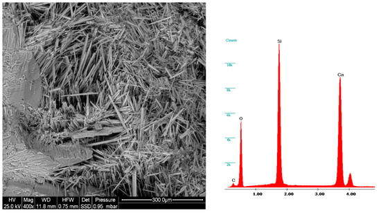 Xonotlite was first identified by Rammelsberg in 1866 in carbonate rocks that had undergone contact metamorphism with magma in Tetela de Xonotla, Mexico (whence the mineral is given its name) [36]. Since then, although it is a rare mineral, xonotlite has been discovered to fill veins and cavities in heat-altered rocks, and less commonly due to metasomatic reactions in rodingites [37]. Xonotlite has a monoclinic crystal structure, typically forming thin, needle-like (acicular) or fibrous crystals a few millimeters in size. Its structure consists of chains of tetrahedra alternating with calcium–oxygen layers [38]. These layers contain calcium ions in two coordination types: seven-fold (CaO7) and octahedral (CaO6) [39]. This arrangement allows xonotlite to exist in at least six structural variations (four ordered and two disordered forms) or polytypes [40,41].
