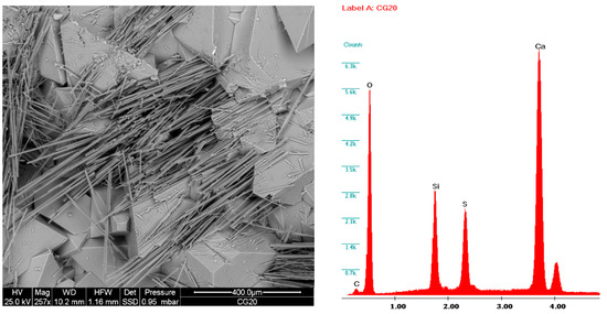 Thaumasite is a rare, naturally occurring mineral discovered in 1878 by Baron von Nordenskiöld at the Areskuta copper mine in Sweden. Its name comes from the Greek word thaumazein, meaning “to be surprised”, due to its unusual composition, which includes carbonate, sulfate, and hexahydrosilicate groups. A very particular crystal chemical formula characterizes thaumasite: it contains ~42% H2O, 7% CO2, 13% SO3, 28% CaO, and 10% SiO2, giving it a very low density (~1.89 g/cm3). Thaumasite formation requires a source of these ions. The crystal-chemical structure of thaumasite was solved only recently (late 1900s) through X-ray diffraction analysis of single crystals [42,43,44]. It consists of columns of [Ca3Si(OH)6(H2O)12]4+ parallel to [001] and linked to CO32− and SO42− groups and water molecules via hydrogen bonds. Thaumasite is the only known mineral with silicon in six-fold coordination with hydroxyl groups (OH) under low-pressure conditions [45,46]. Thaumasite belongs to the ettringite group and forms a secondary phase at low temperatures in mafic igneous and metamorphic rocks. It is often found alongside minerals like ettringite, zeolites, calcite, gypsum, and tobermorite. In concrete, thaumasite is significant due to its role in sulfate attack, where sulfate ions react with cement compounds (C-S-H, portlandite) to form gypsum, ettringite, or thaumasite [47,48,49,50]. These reactions degrade concrete in sulfate-rich environments.