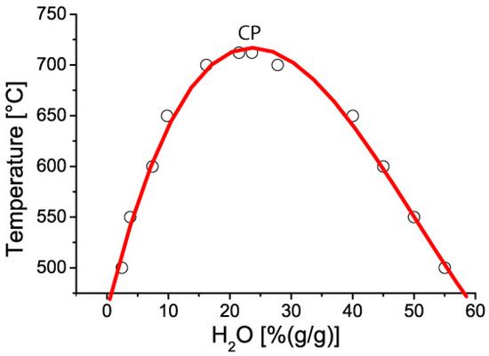 The relationship between solvus and Lorentzian distribution of elements, here Sn, is typical for pegmatites, and we interpret that as the first hint for the interaction of supercritical fluids with granites and other crustal rocks. At the solvus crest (critical point, CP), we observe the highest element enrichment, here about 0.6 (mol/mol) SnO2. Further studies confirmed that the highest measured Sn value was 16,430 ppm at 26.5 (g/g) H2O, corresponding to 1.39 (mol/mol) SnO2. That means, at least, that the Lorentzian distribution is a first approximation. Much work is necessary to solve these complex questions. Such distributions (pseudo-binary solvus curves (H2O-silicate melt versus temperature and Lorentzian element distribution)) are untypical for processes in the normal hydrothermal state, which is far away from the supercritical state here considered. High values for tin solubility were obtained by [11], with hydrothermal diamond anvil cells and by using alkali carbonate aqueous solutions. They received for the Li2CO3-H2O system 0.41 (mol/mol) SnO2 at about 790 °C and 795 MPa. These values are much lower than the supercritical conditions; however, they are not far from the supercritical state.