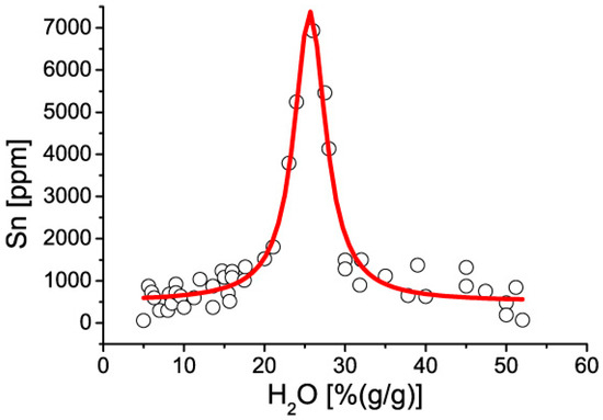 Since the development of the method for the determination of water in glass and silicate melt inclusions [1], the further improvement of this method [2,3], and the completion of the determination of boric acid [H3BO3] [4], we can show that many pegmatites form a pseudo-binary solvus curve in the coordinates water concentration versus temperature. Beginning with the work on the determination of beryllium in pegmatitic melt inclusions [5], it has become more evident from year to year that the solvus curves are also regularly related to trace and some main elements. The maximum of elements are clearly associated with the solvus crest, forming Gaussian or Lorentzian element distribution patterns [6,7]. Figure 1 and Figure 2 exemplarily show such solvus curves and the corresponding Lorentzian distribution of tin. The connection between solvus and, e.g., the Lorentzian distribution is in [8], presented as a three-dimensional plot outlined.