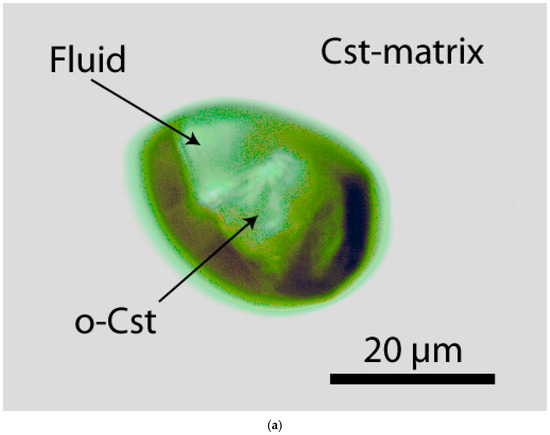 This results in the following question: Are the typical fluid inclusions in cassiterite only (e.g., [19]) proof of the recrystallization and re-deposition of cassiterite under hydrothermal conditions? Up to now, the tin-rich melt inclusions in cassiterite or the high-pressure and high-temperature polymorphs of cassiterite inclusions do not feature in genetic discussions. Is there an analog situation like the emerald formation via supercritical fluids in the Habachtal, Austria [34], where the dominant fluid inclusions represent only the secondary processes and the up-to-now ignored melt inclusions are the primary inclusions generated by supercritical fluids? By this acceptance of supercritical fluids, the contradiction between regional geology and the observation of high-temperature indications can be solved. The proof of diamond (1329.2 cm−1 with an FWHM = 76.3 cm−1) by the first author in the Habachtal emerald supports this statement.