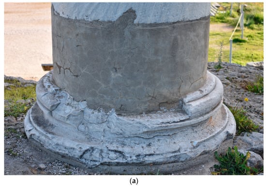 The two drums of the column shafts from which samples were taken are also displayed in the partial anastylosis, PM-KOR-70 and PM-KOR-73. Each represents one drum of a shaft and is preserved in its original height (Figure 6a,b). The dimensions are as follows: PM-KOR-70: height 1.41 m, lower diameter 0.855 m, upper diameter 0.825 m; PM-KOR-73: height 1.77 m, lower diameter 0.865 m, upper diameter 0.855 m. Both drums are unfluted, their surfaces being smoothly dressed.