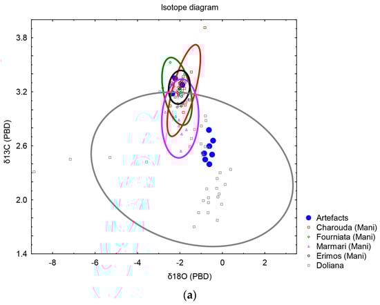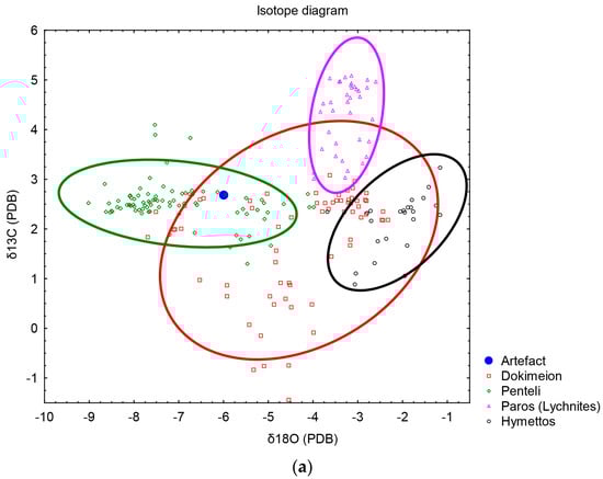 The results of the first group showed that the main source of marble was the Doliana quarry. The following elements were used for the multivariate diagram and the numerical statistical approach (using STATISTICA and SPSS): the variables δ18O ‰, δ13C ‰, Mn, Mg, Fe, Cr, Y, Cd, La, Ce, Yb, and U (Table 2). The multivariate analysis provided a clear differentiation between marble sources, reinforcing the Doliana quarry’s dominance in the sample set. Additionally, including trace elements was crucial for enhancing the accuracy of the statistical classification, allowing for a more detailed provenance study (Figure 15a,b). Initially, during the isotopic comparisons, three of the samples exhibited isotopic characteristics resembling those of the Mani quarries. However, as demonstrated in the multivariate diagram and particularly through the numerical discrimination presented in Table 2, the samples were conclusively identified as Doliana marble.