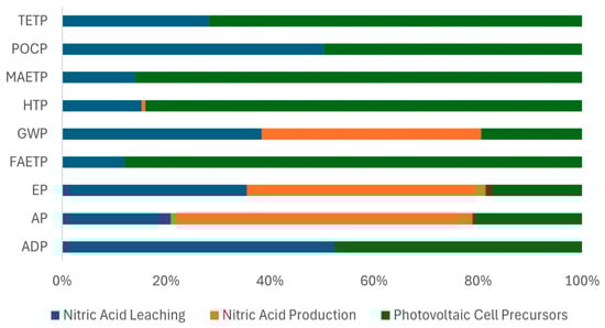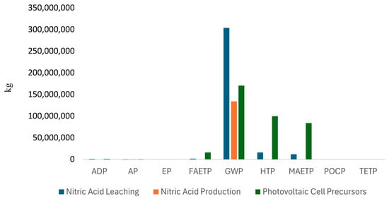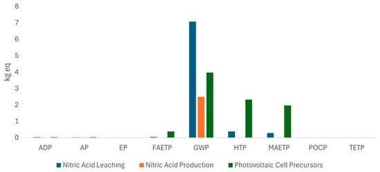 The life cycle analysis performed considered the stages of nitric acid production, the precursors of 1 kg of solar cells, and the process of leaching valuable metals from 1 kg of solar cells. When comparing the environmental impacts of these stages, it is observed that the eutrophication potential, freshwater aquatic ecotoxicity potential, and global warming potential impact categories are higher in the nitric acid leaching process. On the other hand, solar cell processing has a greater impact on abiotic resource depletion, acidification potential, human toxicity potential, marine aquatic ecotoxicity potential, photochemical ozone creation potential, and terrestrial ecotoxicity potential categories. In general, the category with the greatest impact for the three stages studied is global warming potential, generating an impact equivalent to the release of more than 7 kg of CO2.