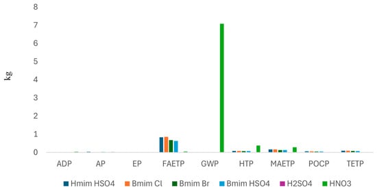 When comparing with similar e-waste leaching processes that propose using sulfuric acid and ionic liquids, it is observed that nitric acid has a higher impact on abiotic resource depletion, global warming potential, human toxicity potential, and marine aquatic ecotoxicity potential, being lower in all other categories. When comparing costs, it is concluded that the nitric acid leaching process is more economical than processes involving ionic liquids but more expensive than sulfuric acid leaching.