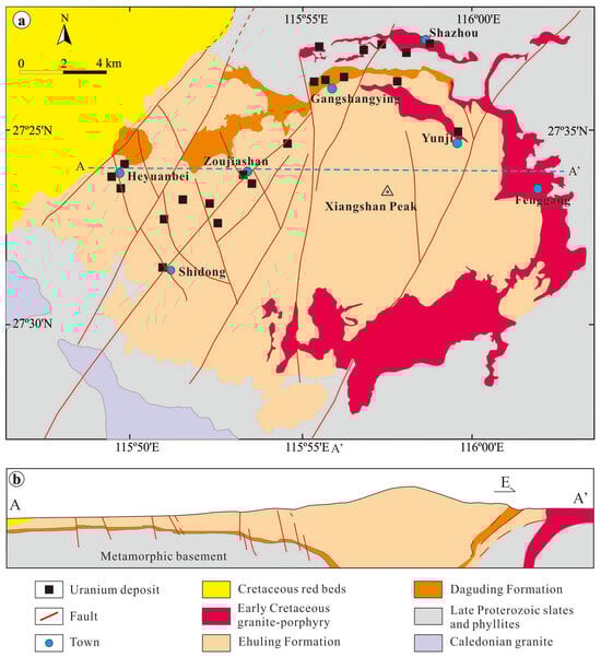 The Xiangshan Volcanic Basin is situated in central and southern regions of the Jiangxi Province [18], along the structural junction of the Yangtze and Cathaysia plates (Figure 1). The basin extends approximately 26.5 km in the east–west direction and about 15 km in the north–south direction, covering an area of roughly 309 km2 [19,20]. This region has experienced numerous structural and mineralization processes that are conducive to the formation of uranium–multi-metal deposits, generating the largest volcanic-type uranium ore in China [19,21].