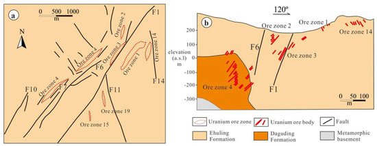 The structures in the Xiangshan Basin occur in both the basement and cover. The structures in the basement are dominated by EW-trending faults, along with NS-, NE- and NW-trending faults. The cover structures are dominated by NE-trending faults, as well as some EW-, NE- and NW-trending faults [19,29]. The intersection of NE-trending faults, EW-trending faults and volcanic collapse structure controls the localization of uranium deposits [28,30]. The uranium ores in the Xiangshan Basin are mainly concentrated in the northern and western parts of the basin [15,16,27,28].