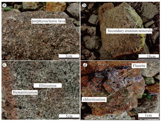 Field petrographic photographs: (a) Porphyritic lava sample with (b) secondary uranium minerals, (c) hematitization and illitization, (d) chloritization and fluoritization.