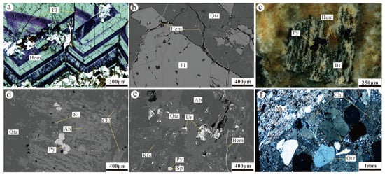 Photographs and photomicrographs of fluorite-type and hematite-type ores, as well as illitized porphyritic lava in the Zoujiashan deposit: (a,b) Hematite and fluorite; (c) Biotite; (d) Pyrite and albite; (e) Uranium minerals; (f) Sericitized sample. Fl, fluorite; Hem, hematite; Qtz, quartz; Py, pyrite; Bt, biotite; Rt, rutile; Ab, albite; Chl, chlorite, Kfs, K-feldspar; Sp, sphalerite; Ur, uraninite; Mus, muscovite.