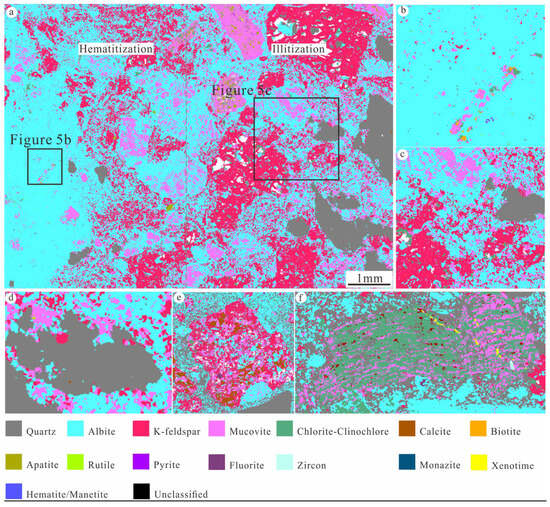 The results of TIMA mapping quantitatively indicate the spatial distribution features of modal mineralogy from illitized (Ill) and hematitized (Hem) porphyritic lava (Figure 5a–c). The major minerals of the illitized zone are K-feldspar (41 vol%), quartz (22 vol%), sericite (16 vol%) and albite (10 vol%), with minor chlorite–clinochlore (6 vol%), biotite (3 vol%) and apatite (2 vol%). In the illitized zone, the dissolution of quartz is observed (Figure 5d) and K-feldspar is noticeably albitized (Figure 5e). In addition, chlorite is mainly distributed within K-feldspar grains and the periphery of sericite, and minor apatite is observed in sericite. Locally, biotite is replaced by chlorite and sericite (Figure 5f).