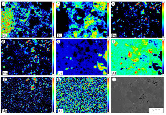 Elemental mapping using μ-XRF on the adjacent illitized and hematitized zones in altered porphyritic lava suggests that most elements have visible zoning (Figure 6). The distribution of Na and K is extremely heterogeneous, and Na is mainly distributed in the hematitized zone (Figure 6a), which is caused by the large amount of albite. However, K is mainly distributed in the illitized zone (Figure 6b), due to the presence of K-feldspar, sericite, chlorite and biotite. The distribution of Fe and Mn is similar. From the illitized to hematitized zones, the contents of Fe and Mn decrease slightly (Figure 6c,d), probably because of the reduction of biotite and chlorite. Additionally, Fe in the hematitized zone is mainly in the form of hematite. Si, Al, Mg and U are relatively evenly distributed in the altered rocks, except that quartz is relatively rich in Si and low in Al content (Figure 6e–h).