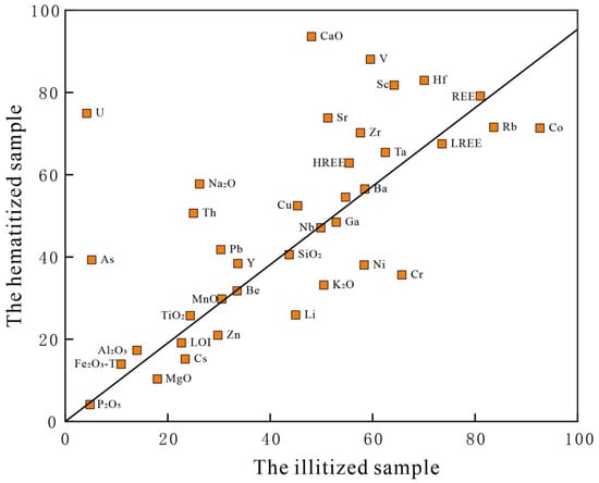 In the mass balance calculation, elements P, Mn and Ti, which align on the linear trend line, were selected as reference markers. The fitting curves of these elements were utilized to evaluate elemental gains and losses in the illitized and hematitized samples, as illustrated in Figure 7.
