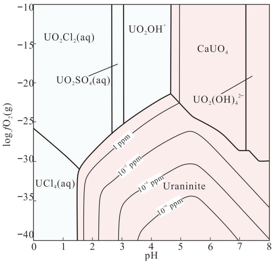 As shown in Figure 8, uranium can be dissolved under both oxidized and reduced conditions. Under reduced conditions, uranium in fluids is mainly present as UCl4(aq). The dissolving of high concentrations of uranium in reduced conditions requires very low pH (pH < 1.8 for 1 ppm U in fluids). In oxidized conditions, uranium can be dissolved in a wider pH range (pH < 5 for 1 ppm U in fluids). The predominant U-bearing aqueous species change with pH. At pH < 2.7, the predominant aqueous species is UO2Cl2(aq). At 2.7 < pH < 3.0, UO2SO4(aq) is the most important complex. At 3.0 < pH < 4.6, U is mainly present as UO2OH+. Under very high pH conditions (>8), U is mainly dissolved as UO2(OH)42−. Two U-bearing minerals are present, i.e., the reduced uraninite and oxidized CaUO4.