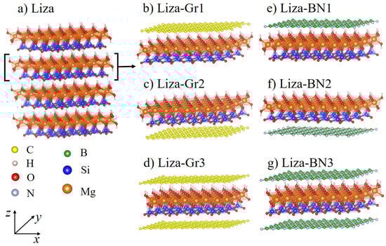 The superstructures to study the contribution of graphene and h-BN for the reinforcement of lizardite: (a) Liza—a slab extracted from the pristine lizardite layered crystal; (b,e) Liza-Gr1 (Liza-BN1)—a monolayer of Gr (h-BN) over the octahedral face of the pristine lizardite slab; (c,f) Liza-Gr2 (Liza-BN2)—a monolayer of Gr (h-BN) under the tetrahedral face of the pristine lizardite slab; (d,g) Liza-Gr3 (Liza-BN3)—a slab of pristine lizardite sandwiched between two monolayers of Gr (h-BN).