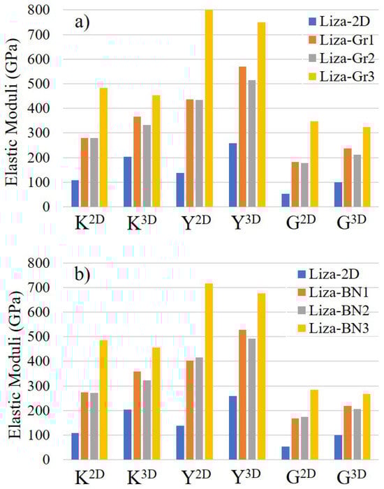 The reinforcement of the lizardite slab by the Gr and h-BN layers significantly enhances its elastic moduli, as illustrated in Figure 2a,b, respectively, and listed in Table 2. The data for Liza-2D are represented by blue, Liza-Gr1 and Liza-BN1 by brown color, Liza-Gr2 and Liza-BN2 by gray and Liza-Gr3 and Liza-BN3 by yellow. It is interesting to highlight that for the superstructures Liza-Gr1 and Liza-Gr2, as well as Liza-BN1 and Liza-BN2, in which the lizardite slab is singly reinforced by Gr and h-BN sheets, respectively, the two-dimensional layer modulus , Young’s modulus and shear modulus increase by approximately three times the corresponding value of Liza-2D. For the superstructure Liza-Gr3 and Liza-BN3, which is doubly reinforced by Gr and h-BN sheets, respectively, the enhancement in is approximately four times that in and is approximately six times that of Liza-2D. Analyzing the quasi-two-dimensional elastic moduli, for Liza-Gr1, Liza-Gr2, Liza-Gr3, and their counterparts Liza-BN1, Liza-BN2 and Liza-BN3, the quasi-two-dimensional bulk modulus increases by approximately two times and and enhance by approximately three times the respective values for Liza-2D. The effects of reinforcing lizardite with graphene and h-BN sheets are practically compatible, that is, both significantly enhance the mechanical properties of the lizardite slab, resulting in stronger composite materials. These enhancements are observed experimentally in the mechanical properties of other composites reinforced with graphene, such as the increase of 62% [44] and 93% [79] of the tensile strength of the Al composite reinforced with only 0.3 wt.% and 0.54 wt.% of graphene nanosheets, respectively.