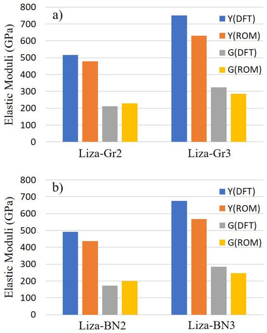 In Figure 3 we compare our results obtained from DFT with those obtained from ROM. In this case, we focus on only two composites, (i) Lizardite reinforced by a single layer of Gr/BN and (ii) Lizardite reinforced by a double layer of Gr/BN. The two single-layer composites yielded comparable results. In (a) we represent the Young’s and shear moduli for Liza-Gr2 and Liza-Gr3, which were calculated using DFT and Equations (7)–(9), where the Young’s modulus Y(DFT) and shear modulus G(DFT) obtained from DFT are presented in blue and gray, respectively. The values Y(ROM) and G(ROM), calculated by ROM, are presented in brown and yellow, respectively. The corresponding results for the same superstructure reinforced with h-BN instead of Gr are shown in (b). We observe that the estimation results from Equations (7)–(9) are in reasonable agreement with the DFT results. If the Gr (h-BN) sheet is well separated from the lizardite slab, the results of Equations (7)–(9) would be exact. However, although weak, interactions exist between the Gr (h-BN) sheet and the lizardite slab, producing internal stress. The above equations work better for materials without misfit and with the same Poisson ratio [84]; therefore, the stresses that arise due to the difference between the Poisson ratio of GR (0.18) or h-BN (0.26) and the lizardite slab (0.36) contribute to reducing the accuracy of the above estimations.