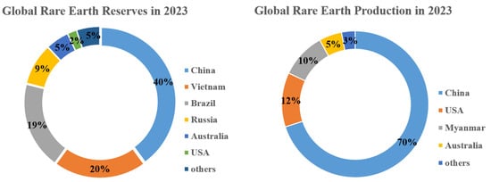Rare-earth elements (REEs) are a set of 17 elements, which include Y, Sc, and lanthanide family elements (such as La, Ce, Pr, Nd, Pm, Sm, Eu, Gd, Tb, Dy, Ho, Er, Tm, Yb, and Lu). Rare-earth resources are nonrenewable and scarce strategic resources, known as the vitamins or spices of industry and the mother of new materials [1]. They are widely used in energy, electricity, new materials, metallurgy, petrochemicals, and other fields [2,3,4]. Their sustainable development is directly related to a country’s economic and social development, industrial security, energy security, and national defense security [3,5,6,7]. For example, Figure 1 gives the plots of global REE reserves and rare-earth ore production for 2023 as announced by the United States Geological Survey (USGS) [8]. It can be seen from Figure 1 that China’s reserves account for 40% in 2023, followed by Vietnam, Brazil, Russia, and Australia. China’s rare-earth ore production will be 69% in 2023, followed by the United States, Myanmar, Australia, and Thailand. Over the last several years, as the rapid development of high-tech, economy, and society, the consumption of rare-earth mineral resources has accelerated, and the primary rare-earth resources are increasingly depleted. The resource utilization rate is still at a low level during the extraction process, but environmental pollution problems are becoming increasingly serious. The uneven application of REEs and the difficulty of high-purity and high-value rare-earth transformation are also significant. The protection and restrictions on rare earths are becoming increasingly strict in various countries in the world. Therefore, it is important to seek new ways to obtain more rare-earth resources.