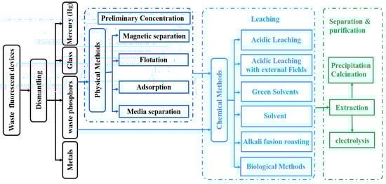 With the execution of the Minamata Convention on Mercury, LCD smart TVs, display systems, and LED components are becoming increasingly used. At the same time, traditional cathode-ray tubes (CRTs) and fluorescent lamps made with rare-earth phosphors as solid luminescent materials are gradually being scrapped on a large scale. The traditional processing methods for these rare-earth fluorescent powder devices are mainly landfill and incineration, which lead to an enormous potential threat to the environment and human health [11,12,13,14]. However, these solid wastes contain a large amount of rare-earth fluorescent powder. The main REEs in these rare-earth fluorescent powders are Y, Eu, Ce, Tb, La, and Ga. According to statistics, the total content of REEs in waste rare-earth fluorescent powder can reach 23%, exceeding the lowest industrial grade of ion adsorption rare-earth ore by more than 250 times and the lowest industrial grade of primary rare-earth ores by more than 15 times [15,16,17,18]. These solid wastes contain many high-priced REEs, among which the content of recoverable REEs is more than 20%, mainly yttrium, europium, terbium, and cerium REEs. They are a rare-earth secondary resource with great potential for recycling [19]. Therefore, the recycling and recovery of REEs from waste phosphors were hot topics of global concern. In recent years, various methods for recovering REEs from secondary waste materials such as waste phosphors have been developed and have made definite progress [20,21,22,23,24,25,26,27,28,29,30,31,32,33,34,35,36,37,38,39,40,41,42,43,44,45,46,47,48,49,50,51,52,53,54,55,56,57,58,59,60,61,62,63,64,65,66,67,68,69,70,71,72,73,74,75,76,77,78,79,80,81,82,83,84,85,86,87,88,89,90,91,92,93,94,95,96,97,98,99,100,101,102,103,104,105,106,107,108,109,110,111,112,113,114,115], and some review articles can be found in the references [20,21,22,23,24,25]. In this paper, we mainly focused on the progress, the flow diagram, and the advantages and disadvantages of each developed method used in recycling the REEs of Y, Eu, Ce, Tb, La, and Ga from waste phosphors in recent years. The prospects and direction for future development were also discussed.