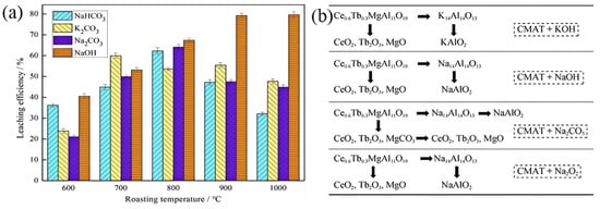 Hua et al. [63] used sodium carbonate (Na2CO3) for alkaline fusion to decompose the stable spinel structure of the Ce0.67Tb0.33MgAl11O19. It was found that the Ce0.67Tb0.33MgAl11O19 was completely destroyed as Tb2O3, α-Al2O3, CeO2, and MgO at 1000 °C for 2 h roasting. Yurramendi et al. [64] applied the Na2CO3 to fusion roast phosphates [68]. The best effect was achieved with a sample and sodium carbonate mass ratio of 1:0.5 at 900 °C for 1 h. The fusion product was leaching with HCl and HSO4 solution. The ultimate leaching efficiency of La, Tb, and Ce was 81%, 85%, and 86%, respectively. When a waste rare-earth fluorescent powder is mixed with Na2CO3 for fusion roasting, Zeng et al. [69] found that the reaction between blue powder, green powder, and sodium carbonate during the calcination process can be expressed by Equations (5) and (6):