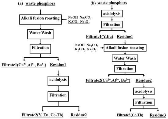 Flow diagram of alkaline fusion roasting to recover REEs from waste phosphors. (a) alkaline fusion-water wash-acid leaching process (b) acid leaching-alkaline fusion-water wash process.