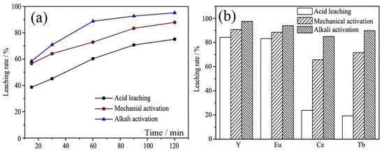 Comparison of the effects of acid leaching, mechanical activation, and alkali activation on the leaching rate of rare earths (a) and leaching rates of REEs dissolved from waste phosphors (b). Reproduced with permission from Ref. [26] published by Elsevier.