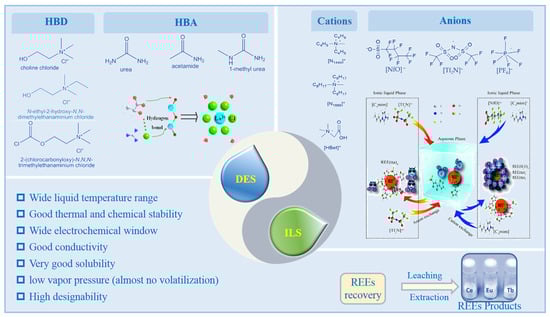 Composition, property of green solvents for REE separation.The HBA:Hydrogen Bond Acceptors; HBD: Hydrogen Bond Donors; DES:Deep Eutectic Solvents; ILS: Ionic Liquids.