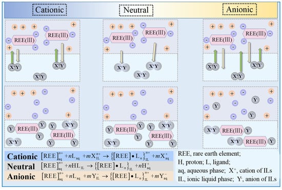 Compared to traditional extractants, ionic liquids are the potential extractants for environmentally friendly and recyclable properties. Yang et al. [113] used bifunctional IL extractants (Bif ILEs) of [A336]P507 and [A336]P204 for the extraction and separation of REEs and metal ions. It showed that at lower pH, RE (III) in the loaded Bif ILEs can be effectively extracted, and the regenerated organic phase can be recycled. [A336]P507 and [A336]P204 are effective extractants for recovery and separation of REEs from waste phosphors. Wang et al. [114] successfully applied the bi-functional IL [N1888]CA12 for Y separation in highly concentrated rare-earth solutions. The approach based on the [N1888]CA12 IL has been tested to be 13 stages of extraction, 8 stages of washing, and 5 stages of stripping, which can obtain Y products with a purity of 99.1 mol%. Tunsu et al. [115] extracted REEs from the leaching solution of HNO3 with a mixture of 35% (v/v) of Cyanex 923/trialkyl-phosphine oxide. Oxides containing 99.96% REEs were obtained, which contained 94.61% Y and 5.09% Eu. The solvent extraction mechanism is described in Figure 7. It can be seen from Figure 7 that the structural characteristics of green solvents such as ILs enable their cations, anions, and themselves to bind well with rare-earth ions, thereby achieving selective and efficient extraction.